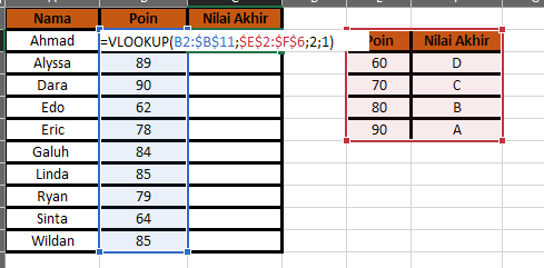 c. Lalu akan memblock data setelahnya yaitu mengenai Poin dan Nilai Akhir. Jadi akan mendapatkan Nilai Akhir dari data yang berada disebelah tersebut. Jadi seperti ini rumusnya dan jangan lupakan tanda"$".