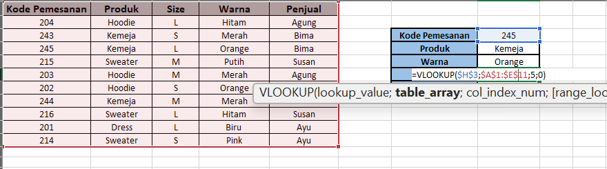 Pertama kita masukan rumus Vlookup pada colom Produk lalu block colom Kode Pemesanan unruk meletakan kode tersebut. Misalnya akan mencari data Kode Pemesanan dengan kode 245.